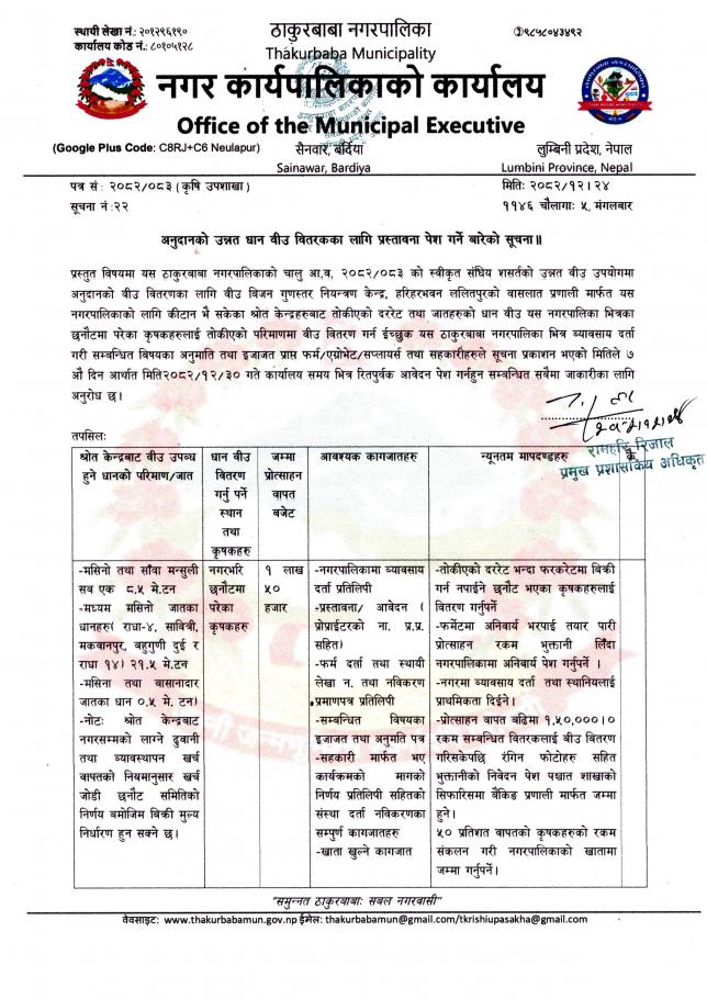 खाधान्न बाली (धान) को उन्नत वीउ उपयोग मुल्यमा अनुदानका लागि आवेदन पेश गर्ने बारेको सूचना!!