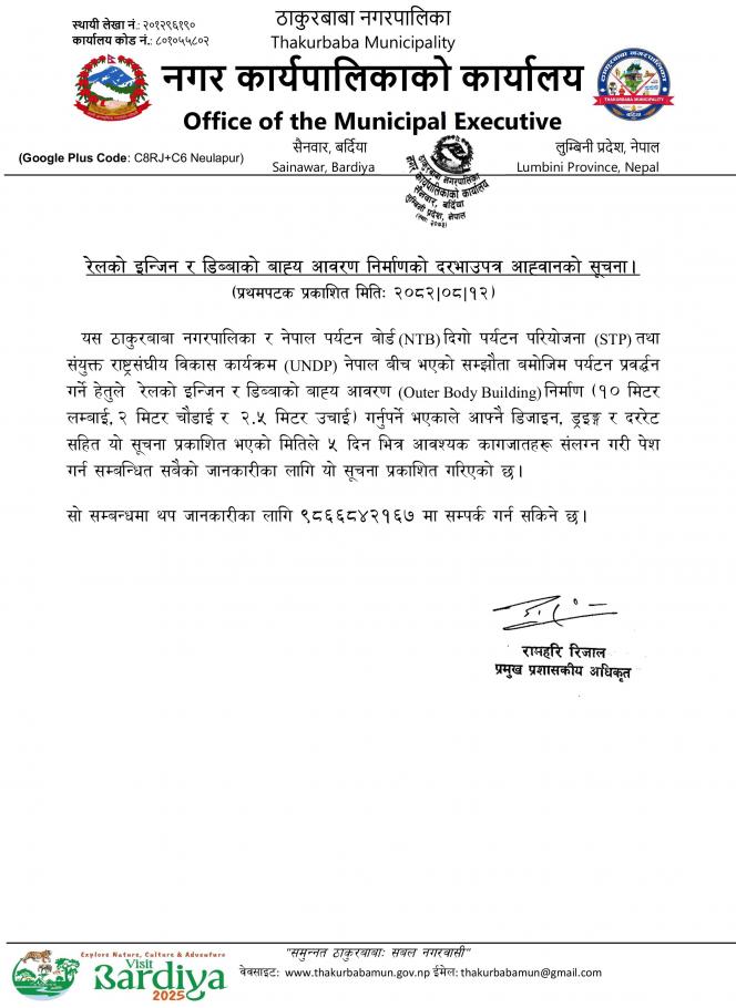 रेलको इन्जिन र डिब्बाको बाह्य आवरण निर्माणको लागि दरभाउपत्र आह्वानको सूचना!!