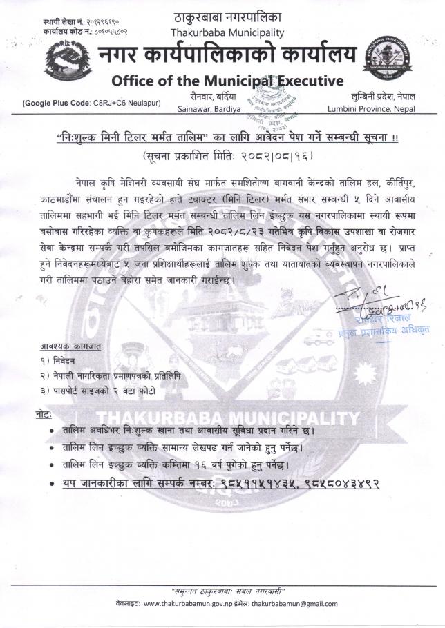 “निःशुल्क मिनी टिलर मर्मत तालिम” का लागि आवेदन पेश गर्ने सम्बन्धी सूचना !!