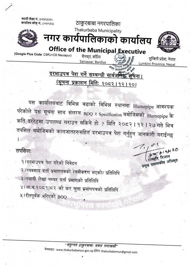 "ह्युमपाइप" का लागि दरभाउपत्र पेश गर्ने सम्बन्धी सार्वजनिक सूचना!!